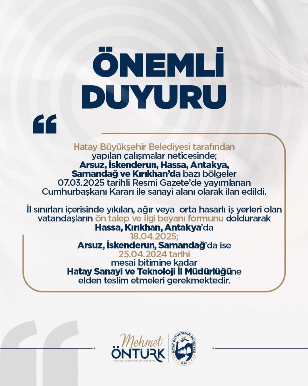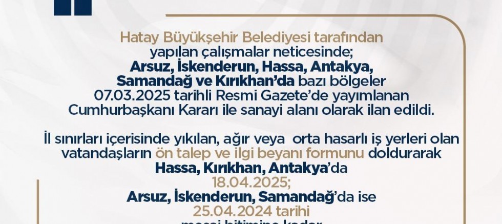 Talep formu: https://www.sanayi.gov.tr/medya/duyurular/hatay-ilinde-bakanligimiz-tarafindan-yapilmasi-planlanan-sanayi-isyerleri-icin-on-talep-duyurusu
