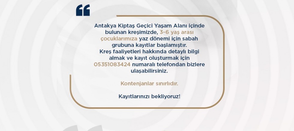 HBB Sağlık ve Sosyal İşler Dairesi Başkanlığı, Antakya Gülderen Mahallesi’nde yer alan Kiptaş Geçici Yaşam Alanı içinde hizmet veren kreş için, 3-6 yaş arası çocuklara yönelik yaz dönemi sabah grubu kayıtlarını almaya başladı.