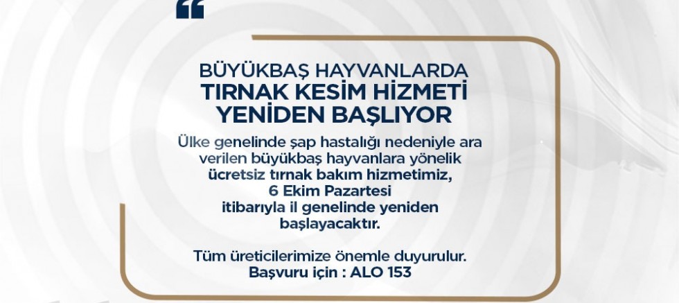 HBB Tarımsal Hizmetler Daire Başkanlığı, ülke genelinde şap hastalığı nedeniyle ara verilen büyükbaş hayvanlara yönelik ücretsiz tırnak bakım hizmetinin 6 Ekim Pazartesi itibarıyla il genelinde yeniden başlayacağını duyurdu.